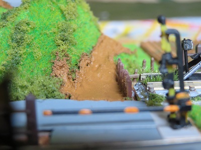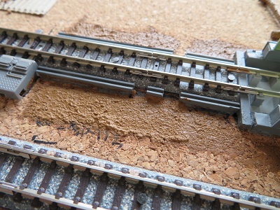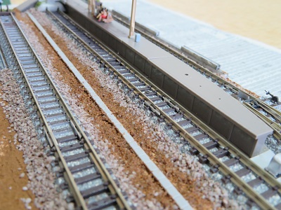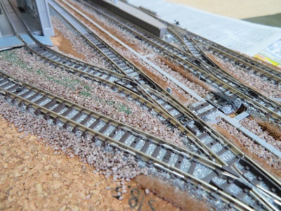 前回の作業終了後、レイアウトを移動(傾けた)時に固定したはずのバラストが剥がれ落ちました。今回はこのバラストの補修から始めていきます。ボンド水溶液をつくった後、補修する場所にバラストを再度散布してボンド水溶液で固定していきます。