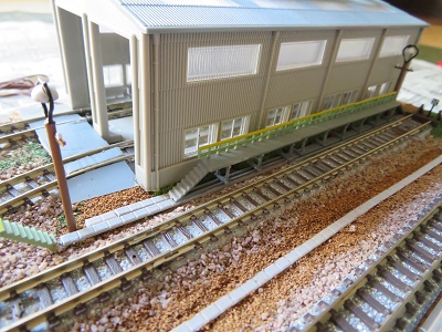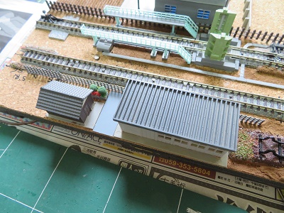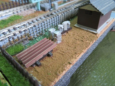 保線用倉庫と資材置き場です。資材置き場には、レールと継電器箱、変圧器を置いてみました。