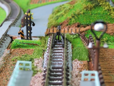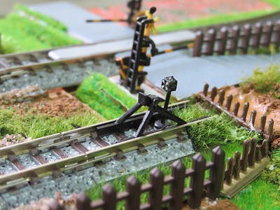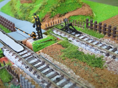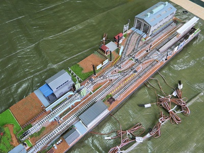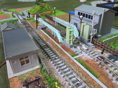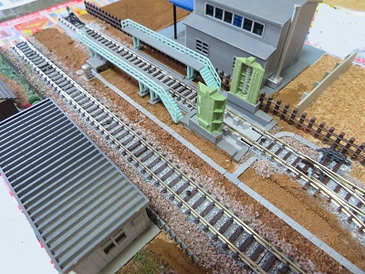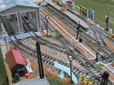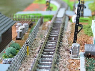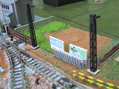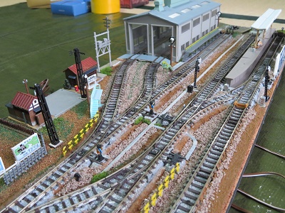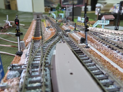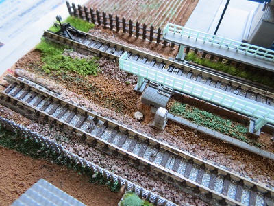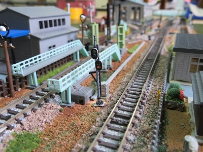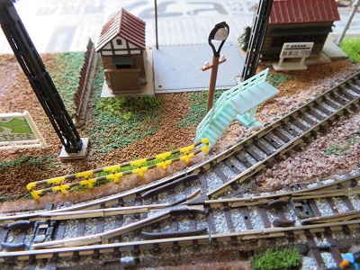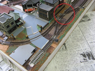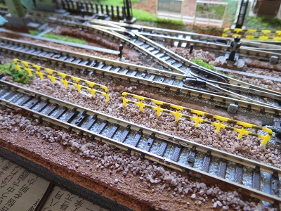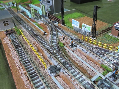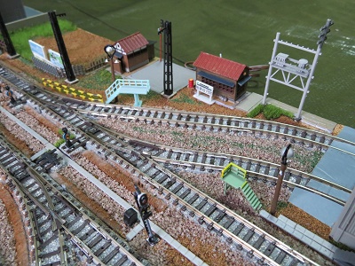 本線と車庫線との渡線です。ポイントは電気式転換機となっていますが、車庫内のポイントは標識付転換機です。あっ、転換機の話は想定で模型的には保線基地線用のポイントが手動以外はすべて電動ポイントです。