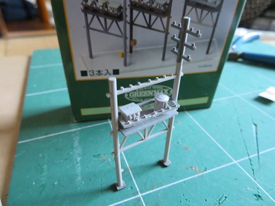 変圧器柱を組み立てました。GM製のストラクチャーです。ジャック品の中から探してきました。電柱の腕金部分は他の部品から調達です。
