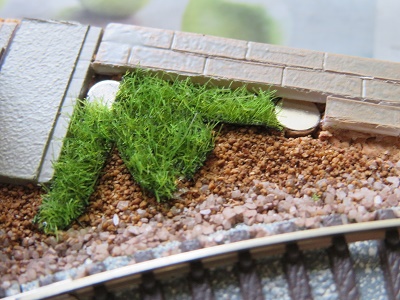バラストの補修が終了したら、草地の制作に着手します。100円ショップのセリアで買ってきたグリーンマットを使用して草地を表現していきます。適当な大きさにハサミでカットしてゴム系ボンドで接着していきます。