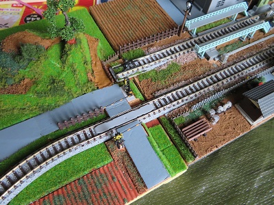 手直しした後のレイアウト接続部分です。上から見れば丘へ登る道は出来上がっているようです。道の平面性はじっくり見なければわからないので気にしない。気にしない。