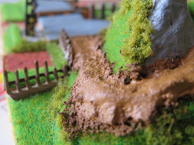 気になりだしたら、もう止まらない?。ということで丘へ登る小道を補修します。タミヤの情景ステクチャ―ペイントが硬化したので重ね塗りを試みます。それと合わせて道路の平面性もチャレンジです。