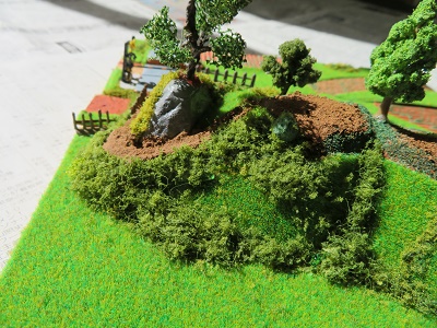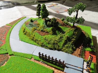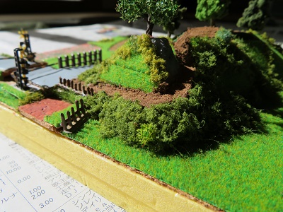 カーブして丘の上に続く道。こちらはかなりの急坂です。土の階段を表現したいけど、この情景ステクチャ―ペイントでは、技量がないから難しいかな。