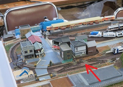 模型の運転席から赤矢印の洋館に隠れてポイントの動きが見えない。