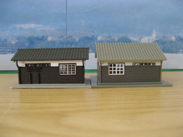 左右が入れ替わっています。KATO製(左側)の建物の名称は「配電室」ですが、アシェット(右側)は「貨物営業所」となっています。