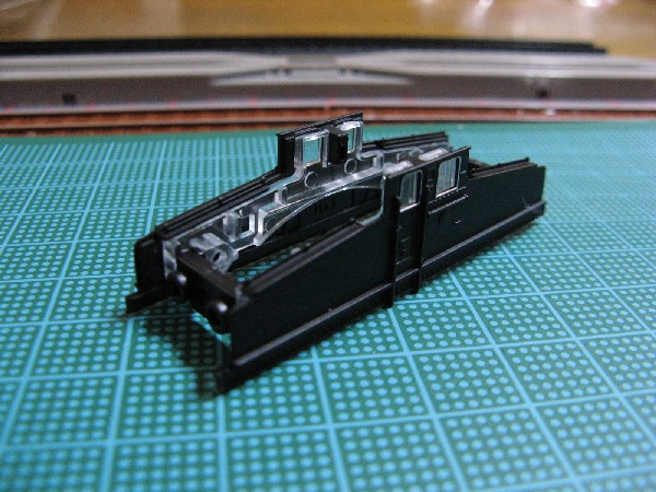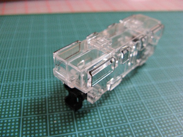 動力ユニットの前後にプラシート(写真の白色片部分)を取り付けます。このプラシート片をつけることで、カーブ区間で動力ユニットの台車が振れたときにボディーと干渉することが防げるようです。