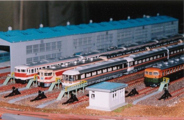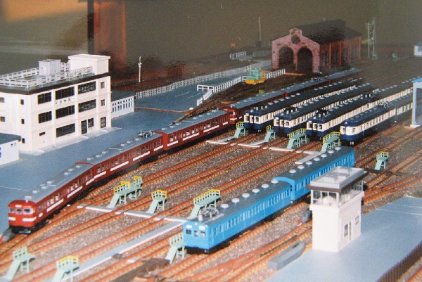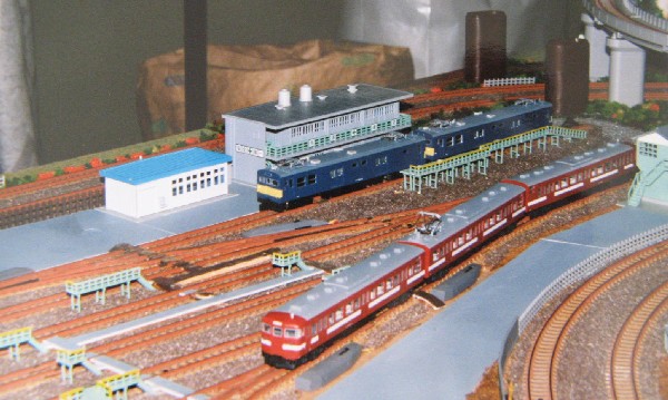 青色の旧型国電の横にある建物が、車庫線のポイントを制御する信号所という設定で、 ワインレッドの115系電車の左横の建物は、運転手さんの事務所 (運転区) という設定です。