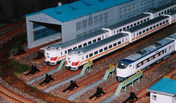 有効長は一番長いところで10両編成が収容出来たハズです。 写真に写っている電車は 「スーパーくろしお」 と 「はるか」 と言うことで、ここの車庫は 「日根野電車区」 にしておきましょう。
