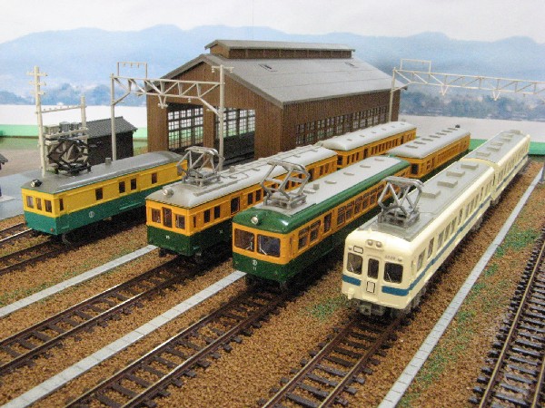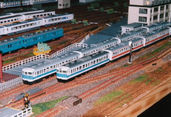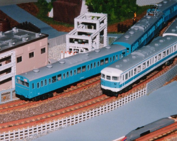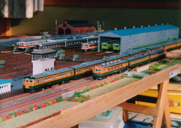 湘南色の115系と165系です。 165系の先頭車両は自作のフリー車両です。165系のグリーン車サロ165に運転台を取り付けて先頭車改造してあります。