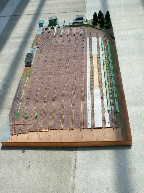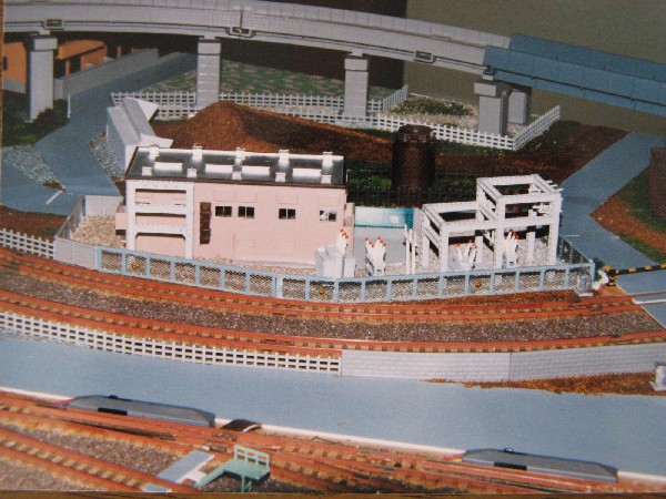 改造後の車庫線レイアウト。 入出庫線側です。 運転手さんの事務所 (運転区) が用地の関係から移設してあります。 車庫線の外周を回っていた本線部分を撤去してレイアウト全体を縮小しました。 変電所の付近に廃線となった本線が残っています。