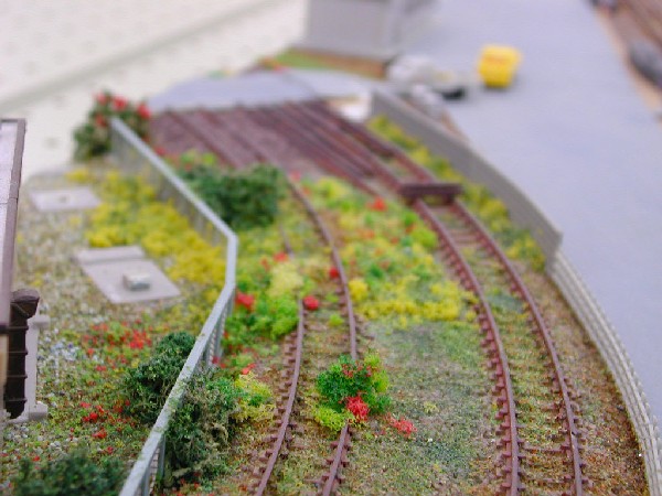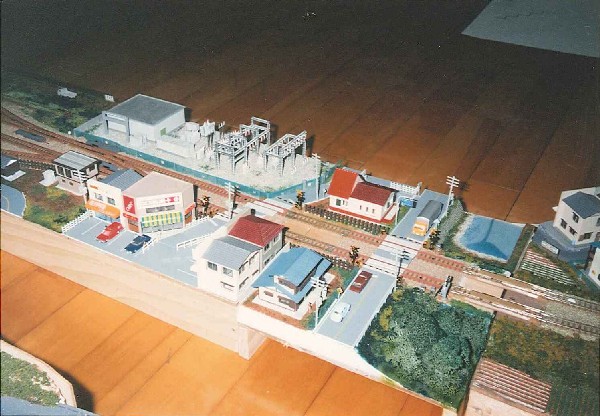 左端の民家の横には、引き込み線の廃線跡を作ってあります。 写真では分かりずらいですが、廃線路ということで踏切部分のレールはアスファルトで埋められている様子を表現してあります。
