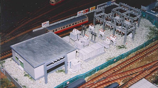 電鉄変電所の全体写真です。 トミックスおよびグリーンマックスの変電所キットを数個組み合わせて製作しました。 製作にあたって地元を走っている私鉄電車の変電所を参考にしてあります。