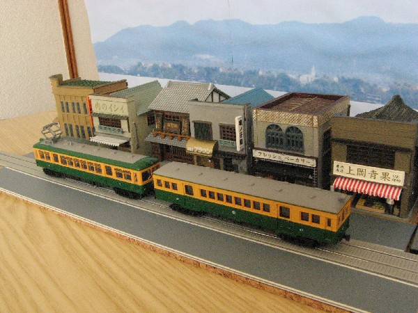 今回の撮影をするためにセットした組みジオラマの全景です。 トミーテックの街並みコレクションとグリーンマックスの路面軌道、そしてプラチック板で自作した道路を組み合わせました。