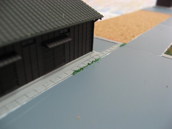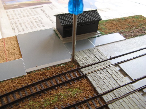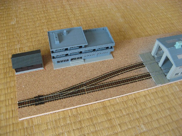 カトー製の詰所で位置を確認します。 道路の位置も建物に合わせて固定します。 カトー製の詰所2棟を取り外してトミックス製の詰所を設置することが出来ます。