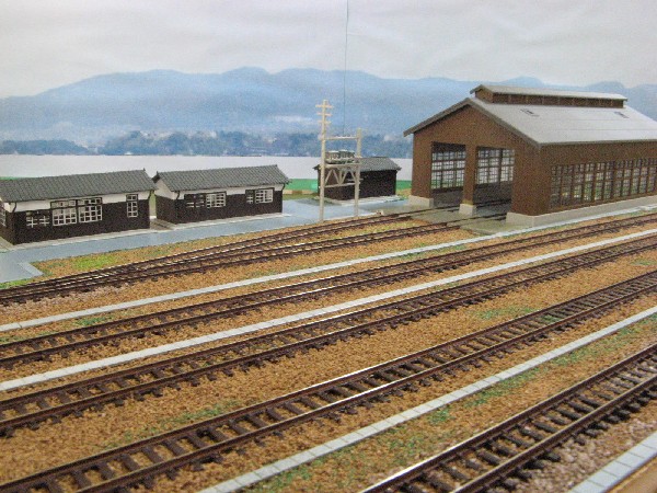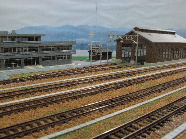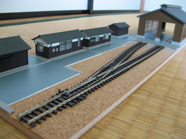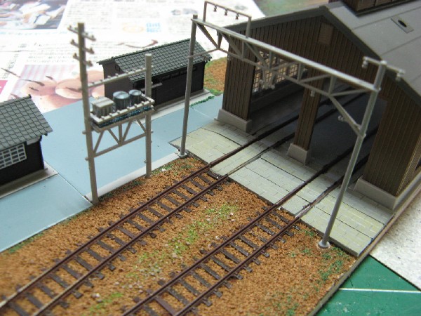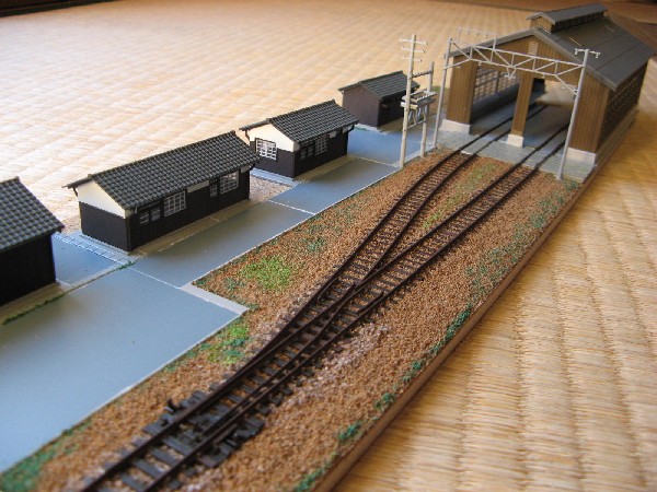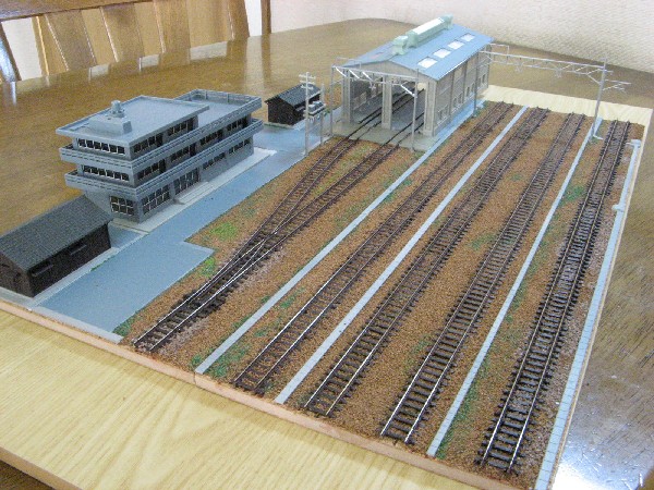 事務所もKATO製の平屋建てに!。車庫の前の架線柱も取り外して非電化の車庫線です。 ディーゼル機関車や蒸気機関車などが似合いそうです。