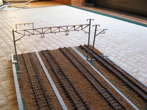 製品は複線用ですので留置線に使用するものは3線用に加工が必要となります。 KATOの複線間隔33mmに合わせて架線柱を切継ぎ3線用の架線柱を製作しました。