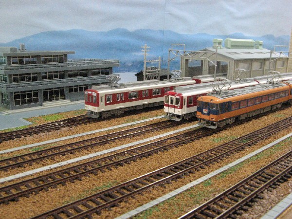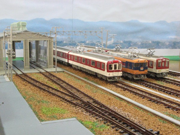 目線を下げて複線車庫と留置線です。 電車がないとさびしいので近鉄電車を並べてみます。