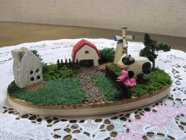 この車庫線の組ジオラマを製作作業中に、チョコタンがジオラマを作りたいと言っていたので 「牧歌の里」 で買った牧場のセット(風車・牛・農業倉庫)と石の家を使ってミニジオラマを作ってもらいました。 柵や草、砂利道などは鉄道模型の物を使用しています。 思っていたよりも意外とチョコタン上手ではありませんか!