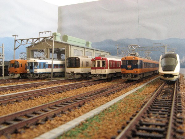 通勤電車と特急車両を並べてみました。 特定地域の近鉄の車庫をモデルにしていませんが、写真に写っている近鉄電車が名古屋線の所属車両なので三重県内の車庫ってことですかね?。 もっともこんな車庫風景は近鉄にありませんが。