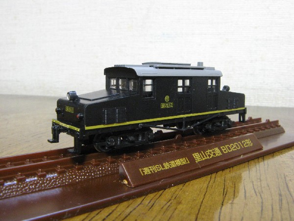 電気機関車となっていますがパンタグラフがありません。 冊子の説明によると蓄電池で動くバッテリーカーという設定だそうです。 それなら一層ディーゼル機関車にしてくれればよかったのにと思います。 車両は以前トミーテックから発売された鉄道コレクション第1弾の 「名古屋鉄道デキ100」 と同じ車両です。 車両は 「里山交通BD2012」 となっています。 里山交通とは架空の鉄道会社です。前作の 「週刊 t鉄道模型 少年時代」 から引き継いだ社名のようです。