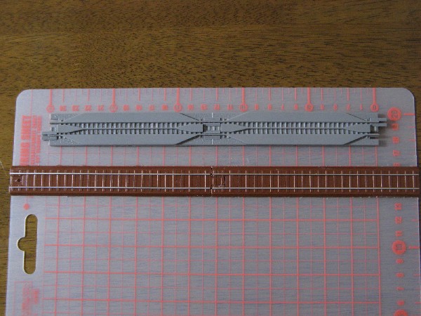 まな板シートに各レールを接着します。 一番上がBトレインショーティーのレールです。 このまな板が工場というわけです。 ここでNゲージの車両を調理?、いや、違った修理します。 工場の製作はこれで終わりです。