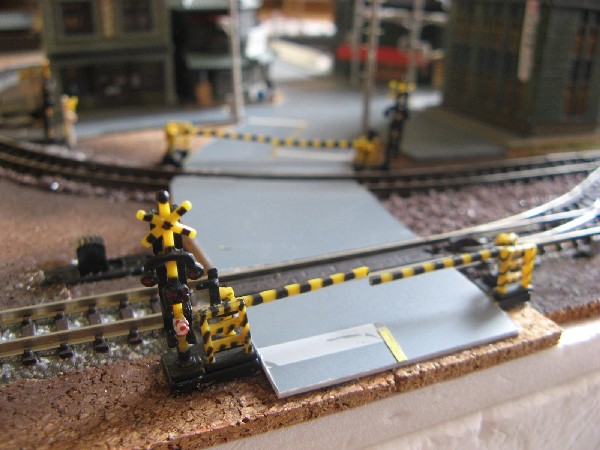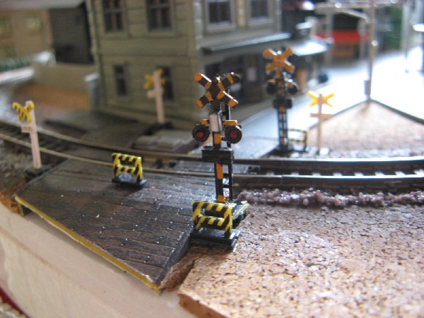 先ほどの写真と同じ場所です。 この踏切(警報機)はレイアウトの端っこでかつ展示側(見学者側)ということで、展示中に警報機が手前側と奥側ともに途中から折れてしましました。 この踏切のパーツは、トミーテックのジオラマコレクションの商品で近年に発売されたのものです。 補修用として予備品を持っていたので交換しました。