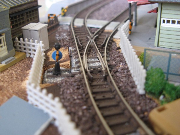 最後に、レイアウトのレベルアップ? ずっと以前にポイントの転轍器標識を買っていたことを思い出して取り付けました。 ここのポイントは発条式転轍器の設定なので、本当は標識の青丸の中に「S」を書き入れたい所なのですが・・・。