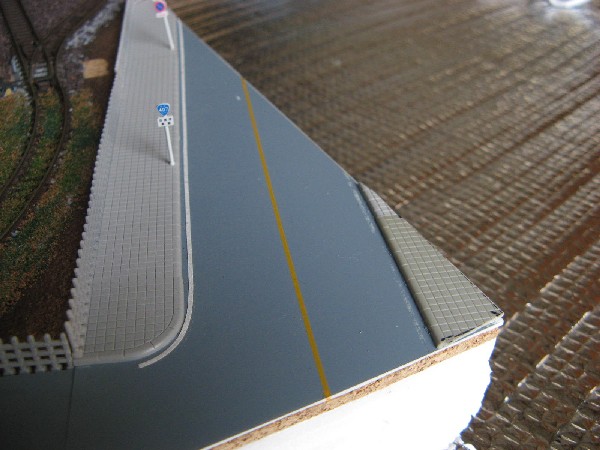 踏切の次は道路です。 レイアウト角っこの歩道のパーツが移動中に取れて無くなっていたので、ジャンク品から作り直しています。