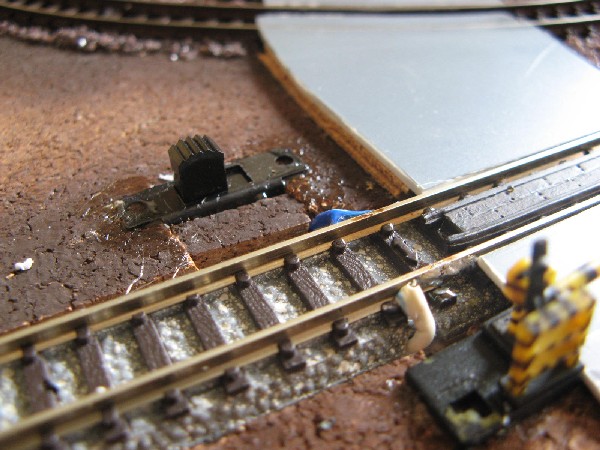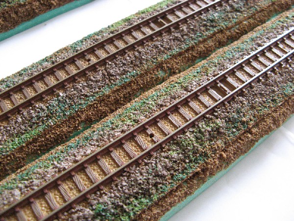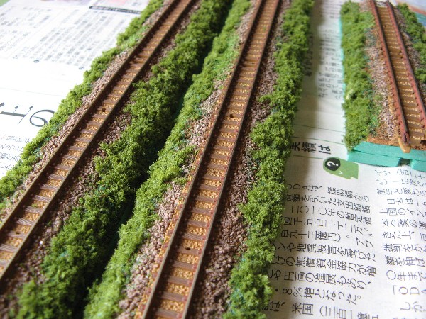 軌道のアップです。 コルク ・ パウダー ・ バラストに、ボンド水溶液がたっぷりと吸いこんでいますので、バラストがなんだか白っぽい写真になっています。