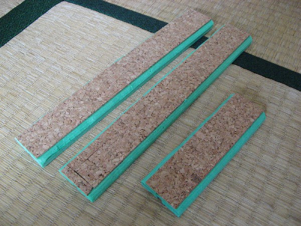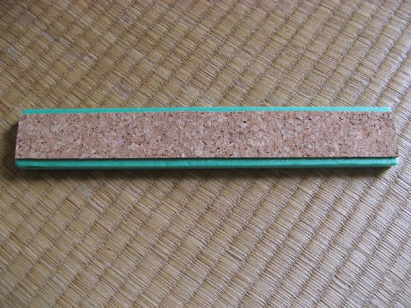 根本となる土台部分が出来たので、次は軌道部分の底面となる施工基面と呼ばれる部分を制作します。 手持ちの資料によると施工基面の幅は、5200mmとなっていますので 1/150 の世界では約 35mm になります。 コルクを 35mm 幅に切って土台部分に接着します。