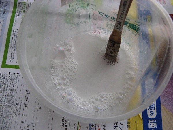 それでは、お決まりの木工ボンド水溶液から! (写真はなしです!) 作って作業開始です。