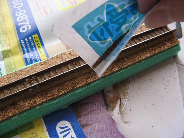 茶色のパウダーで地面を表現した後は、バラストをまいて線路をより実感的に表現します。