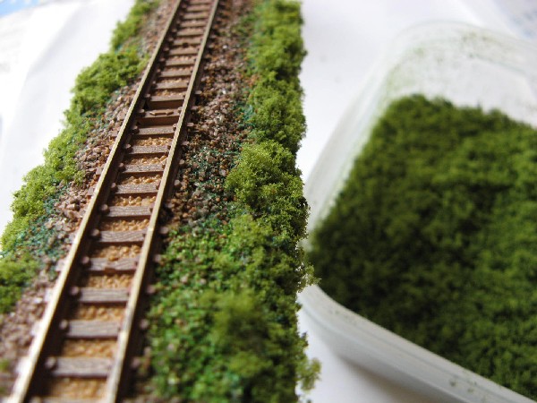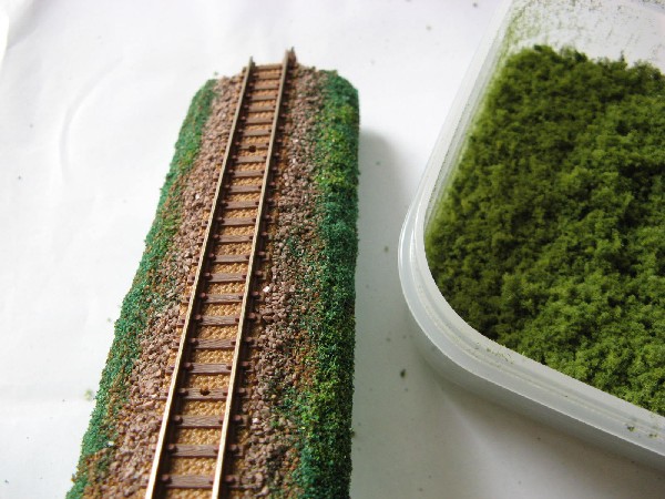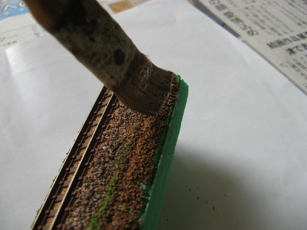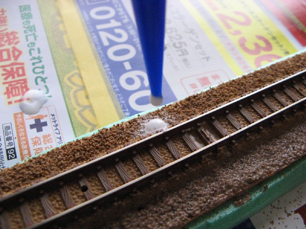 道床にレールを接着剤で取り付けて、しばらく接着剤が固まるまで待ちます。 レールが固定されて動かなくなったら、茶色のパウダーをふりかけて地面を表現します。