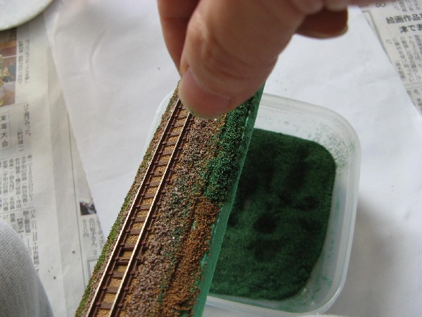 ボンドが乾いたら、次に雑草が生い茂っている感じを出すために緑色のターフを接着します。 接着剤は木工用ボンドを使用しました。