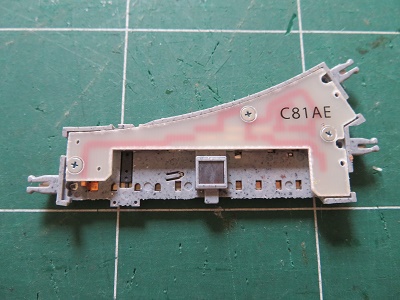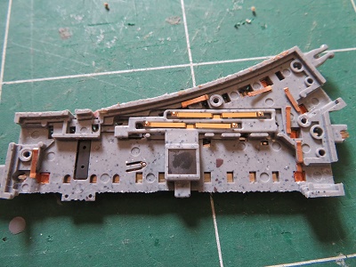 黒い筋のようなものが着いています。これがポイントを切り替えたときにできる接点の汚れです。ひどくなると通電不良をおこす要因となります。こちらもレールクリーナー液で掃除します。すべての清掃が終われば元通りに組み立てていきます。