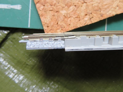 他のレイアウトと接続する部分ですが、この後のバラスト散布後に接続箇所がスムーズに着脱できるようにちょっと加工します。