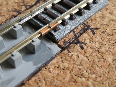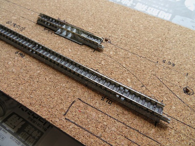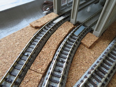 洗浄機を取り付ける位置のレールはKATO製のレールを使いますが、接続するTomix製のレールとは道床の厚みが写真ように違うので、コルクシートを少し低くする必要があります。