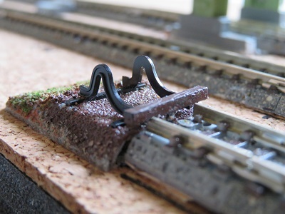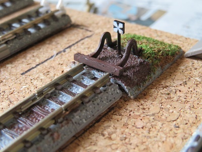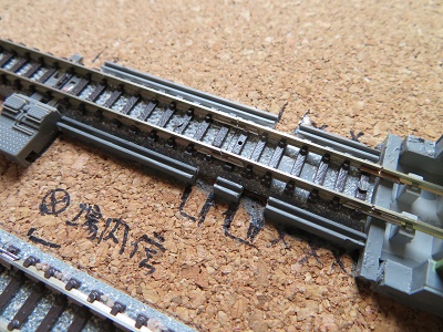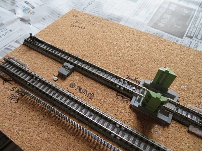 高さを合わせてから車止めを固定します。道床の幅も違いますが、こちらはバラストでごまかしていきます。