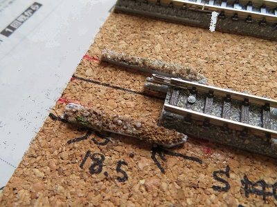 線路の周囲にバラストを散布します。ポイント部分は直接バラストが当たらないように、フェルトを帯状に切り出したものを取り付けました。