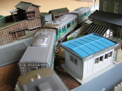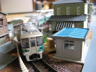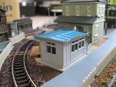 昨日制作した保線詰所。かなり線路に接近しているようなので、列車をレールに載せてみた。