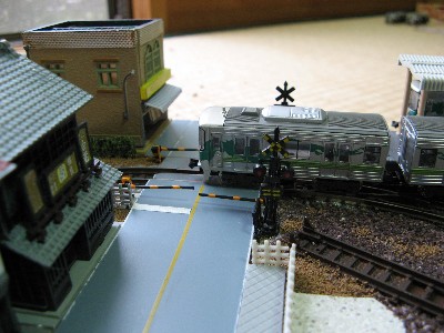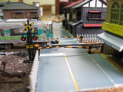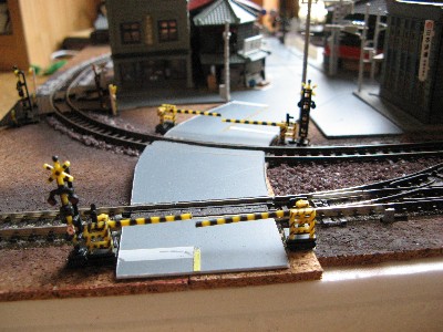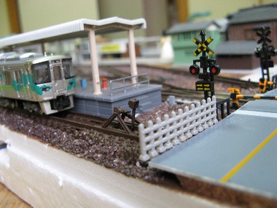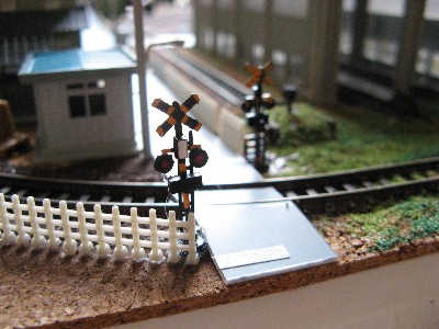 こちらの踏切はちょっと変わった踏切にしてみた。実際にこんな踏切が存在しているのだろうか?その話は別にしておいて。模型の話に戻ります。