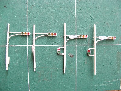 カラーペンで彩色を施して組み立てる。この信号機のキット、車用と歩行者用の信号機を自由に組み合わせるようになっているので、信号機の向きや歩行者用信号機の有無を自由にできる点がよい。しかし、写真からもわかるように支柱から右側にしか信号機を取り付けられず、左側に信号機を取り付けられるようなパーツがなかった。これが災いして?交差点の信号機建柱位置が大変なことに。