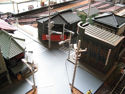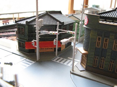 信号機のキットの都合上と変形交差点の関係で、信号機がこちら側に集中してしまった。左側に信号機を取り付けられるパーツがあれば、日通ビルの前に立っている支柱に信号機を2つ取り付けられるのだが。