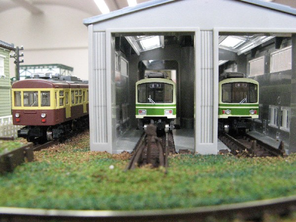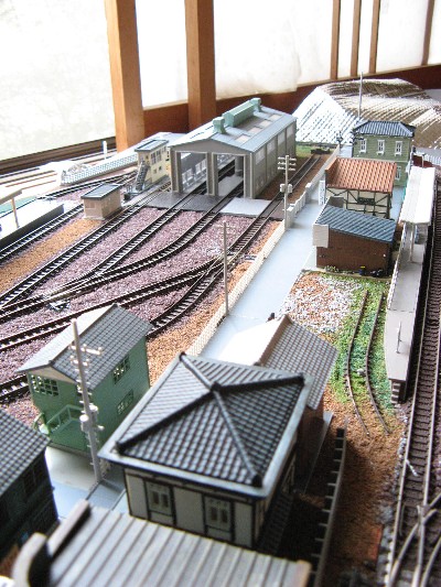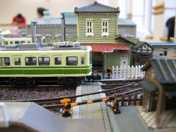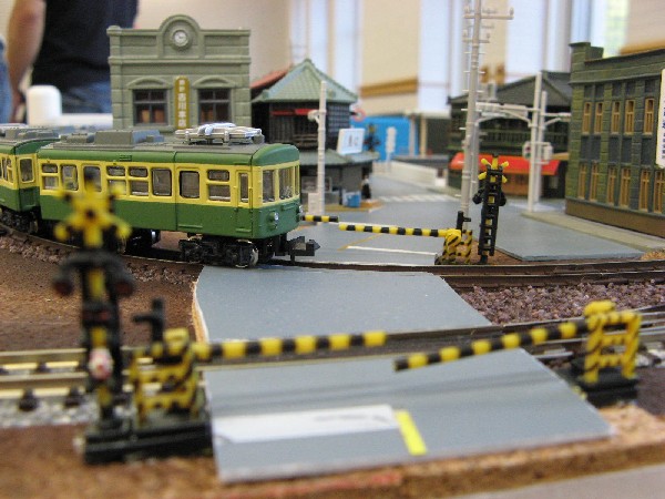 こちらの車庫横の踏切は、交通量の少ない踏切という設定で第3種踏切としてみた。製品は津川洋行製。