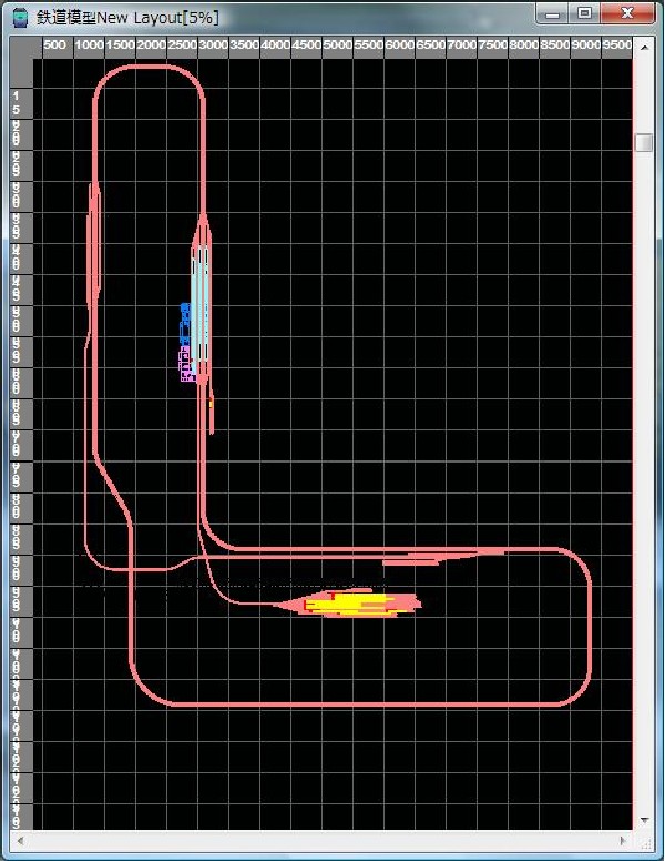まずはレール配置です。L型のレイアウトで全線複線です。それに単線のリバース線と車庫線・車庫出入庫線を追加しています。このソフトのレール規格を、いまだによく理解していないので周回配置にする時、最後のレール接続処理に苦労しています。