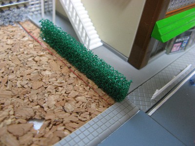 アミューズランドとの境界に生垣を配置する。この生垣は画材店で購入した5mm厚のナイロンタワシのようなものをカットした。つづいてジャンク箱から歩道を取り出して、幅を切り詰めて取り付ける。