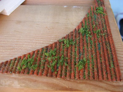 切り取った畑の元は、チョコタンが絵の具で下地塗装をして、茶色、緑色のパウダーで仕上げる。ほとんどの製作をチョコタンに任せる。