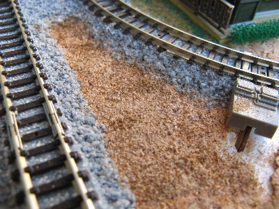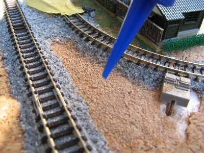 濃い茶色を部分的にふりかけたあとボンド水溶液を垂らす。これで地面が完成する。