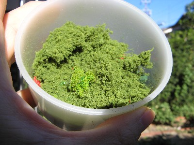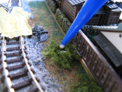 少し茂った草の表現は、フォーリッジ、ターフといった素材を使用する。今回使用したのはフォーリッジという細かいネットにスポンジ粒を絡ませた商品。